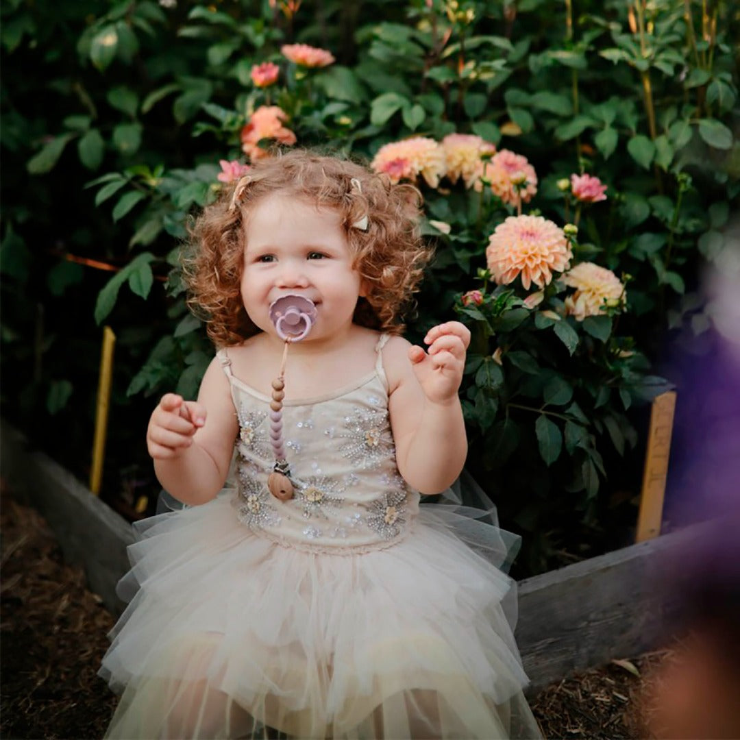 El chupete FRIGG Daisy con bordes adornados que imitan pétalos de flores son la esencia del diseño elegante. Los detalles floridos y modernos llaman la atención de todas las madres preocupadas por el estilo.