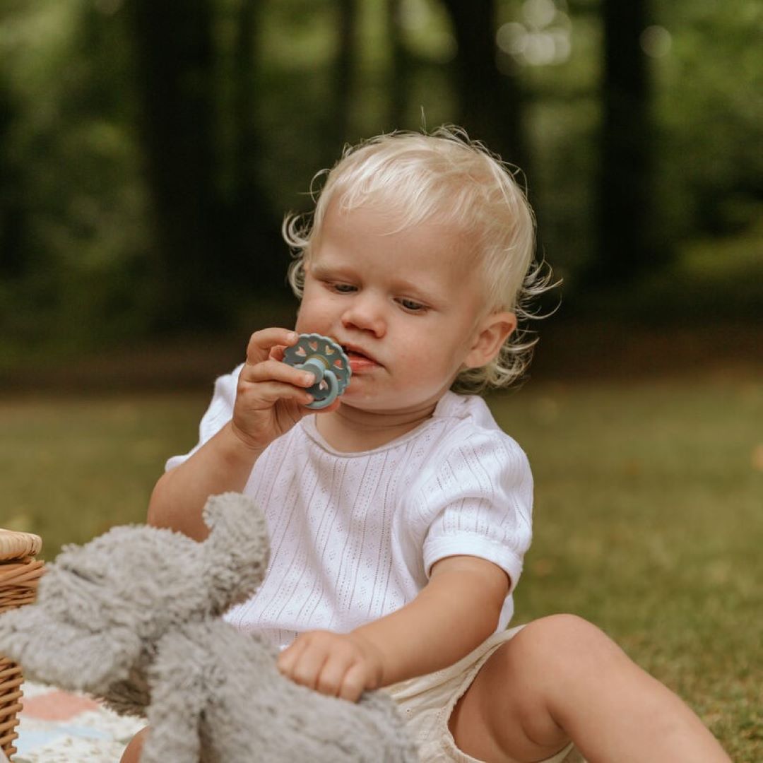 FRIGG Fairytale es un chupete inspirado en la obra del autor danés H. C. Andersen. Es conocido por sus fantásticos cuentos de hadas, pero su mente creativa no solo se mostró a través de sus palabras; también se mostró a través de sus mágicos recortes de papel. FRIGG Fairytale con bordes festoneados y corazones que rodean el escudo imitan un recorte de papel específico de H. C. Andersen. Los 8 corazoncitos sustentan la universalidad de su obra creativa, y simbolizan el amor, el lenguaje universal del mundo. Esta es la inspiración que se encuentra dentro de los chupetes FRIGG Fairytale: son accesibles para todos porque el amor es un lenguaje, todos pueden hablar y entender. Cada color de chupete FRIGG Fairytale lleva el nombre de sus conocidos cuentos de hadas, que dan a los chupetes un toque de imaginación. Color FRIGG - Clumsy Hans (gris sauce)