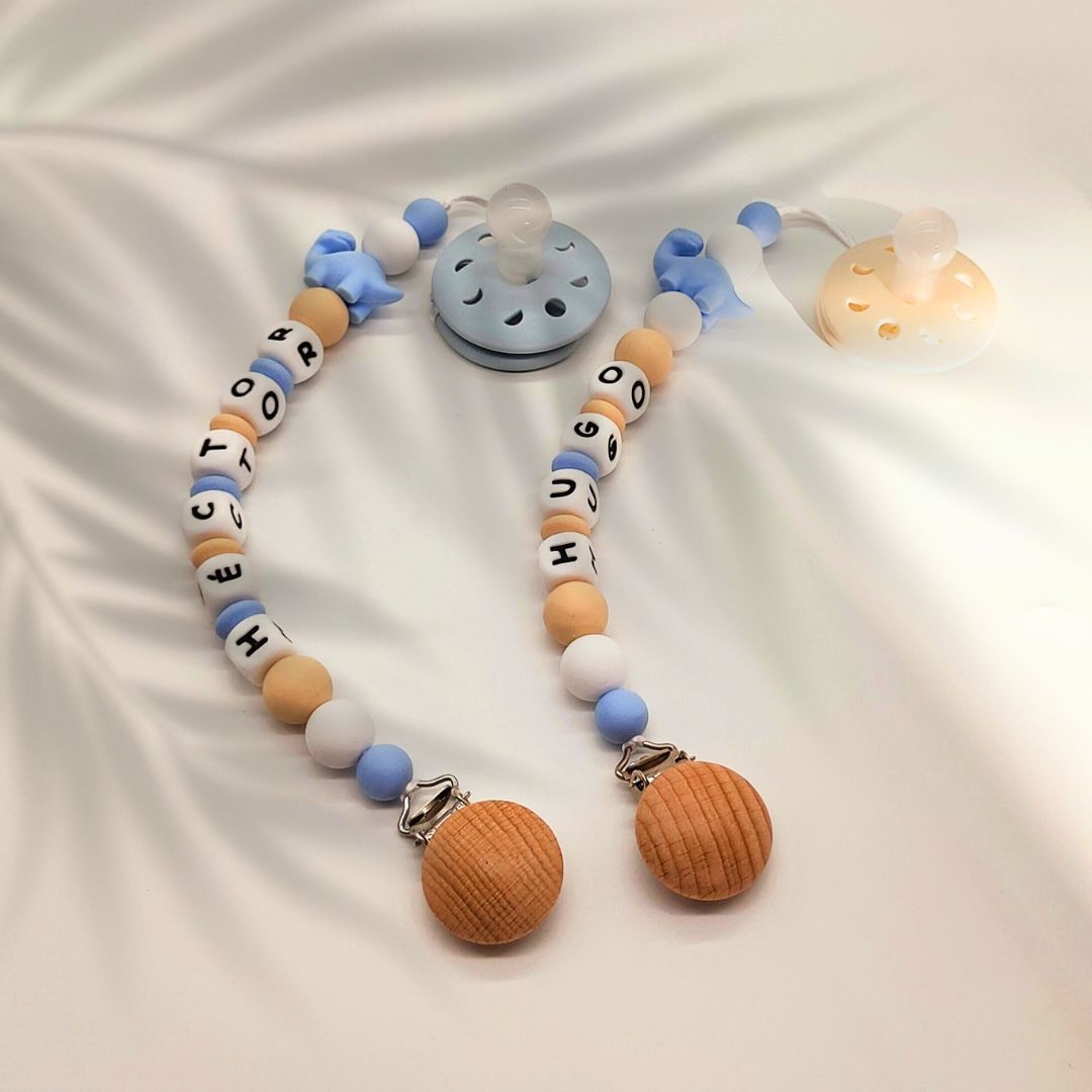 Se sujeta a la ropita del bebé con un clip de madera de Haya natural sin tratar , sin tintes ni barnices. De esta forma tendrás la tranquilidad de saber que no lo perderás ni caerás al suelo. Además, puedes añadir el nombre de tu peque y hacerte con un chupetero personalizado para tenerlo siempre identificado.