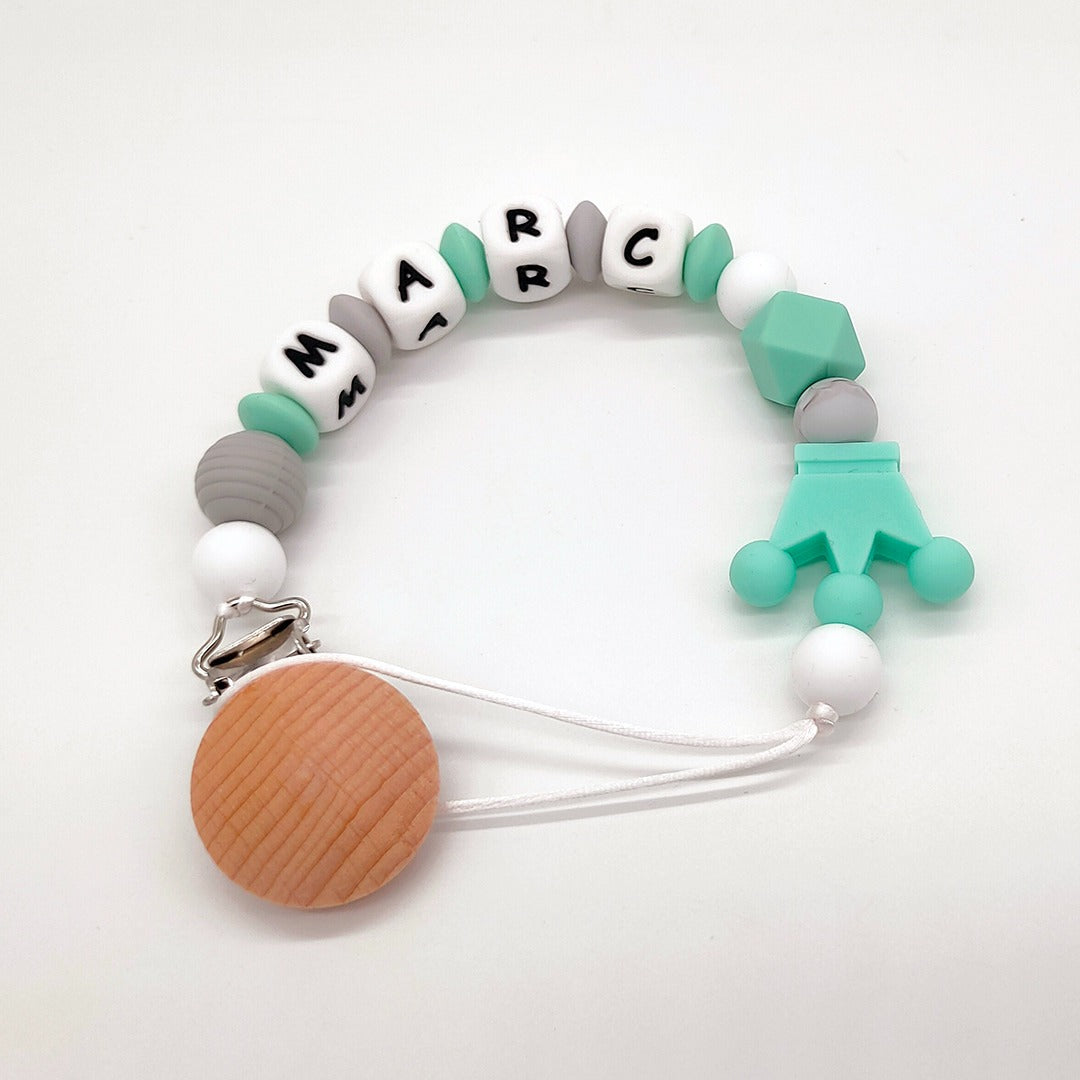 Se sujeta a la ropita del bebé con un clip de madera de Haya natural sin tratar, sin tintes ni barnices. De esta forma tendrás la tranquilidad de saber que no lo perderá ni caerá al suelo. Además, puedes añadir el nombre de tu peque y hacerte con un chupetero personalizado para tenerlo siempre identificado.