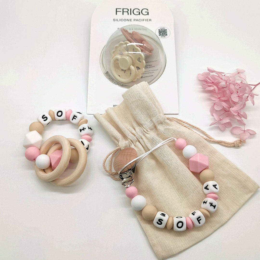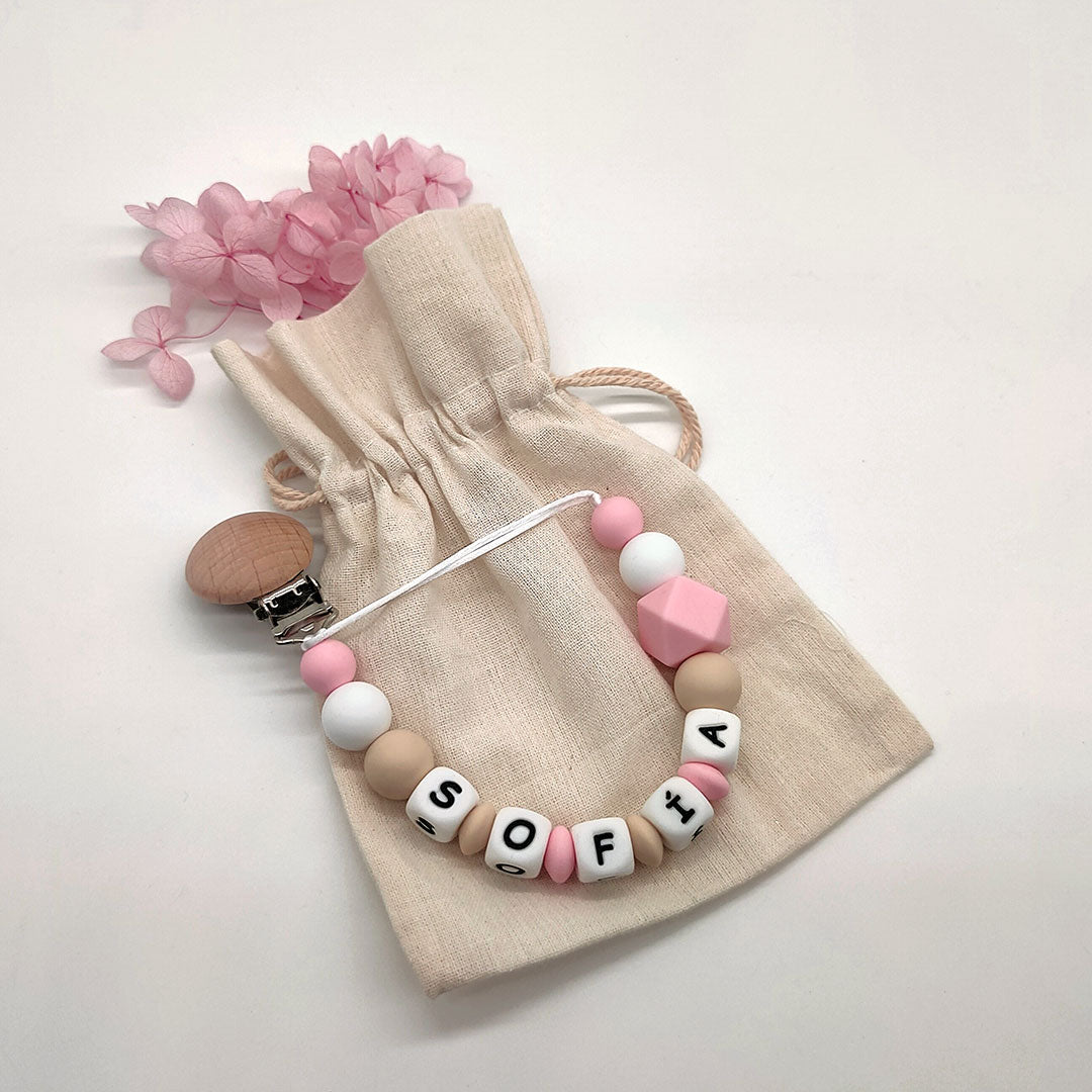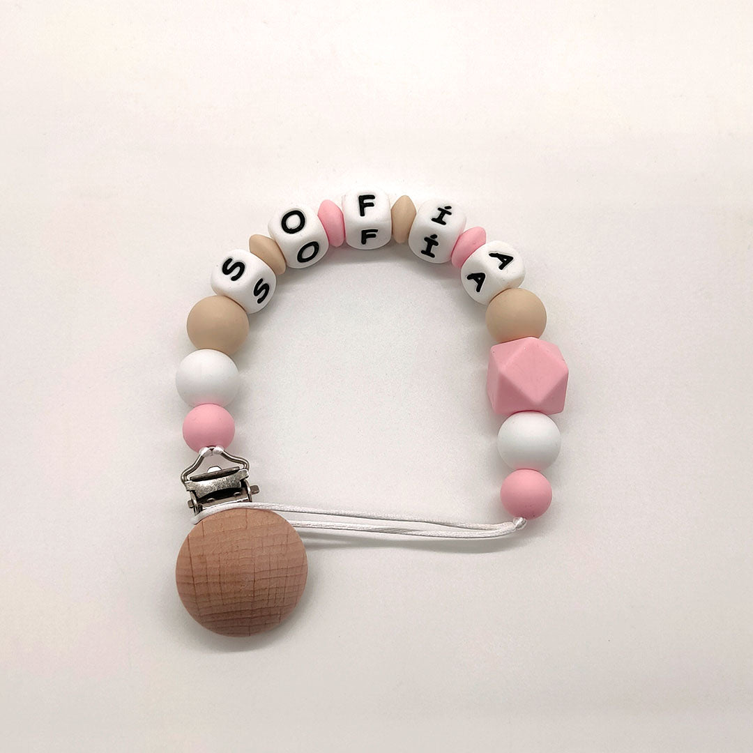 Se sujeta a la ropita del bebé con un clip de madera de Haya natural sin tratar, sin tintes ni barnices. De esta forma tendrás la tranquilidad de saber que no lo perderá ni caerá al suelo. Además, puedes añadir el nombre de tu peque y hacerte con un chupetero personalizado para tenerlo siempre identificado.