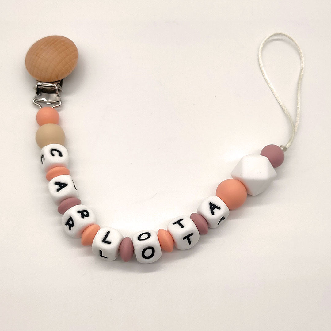 Se sujeta a la ropita del bebé con un clip de madera de Haya natural sin tratar, sin tintes ni barnices. De esta forma tendrás la tranquilidad de saber que no lo perderá ni caerá al suelo. Además, puedes añadir el nombre de tu peque y hacerte con un chupetero personalizado para tenerlo siempre identificado.