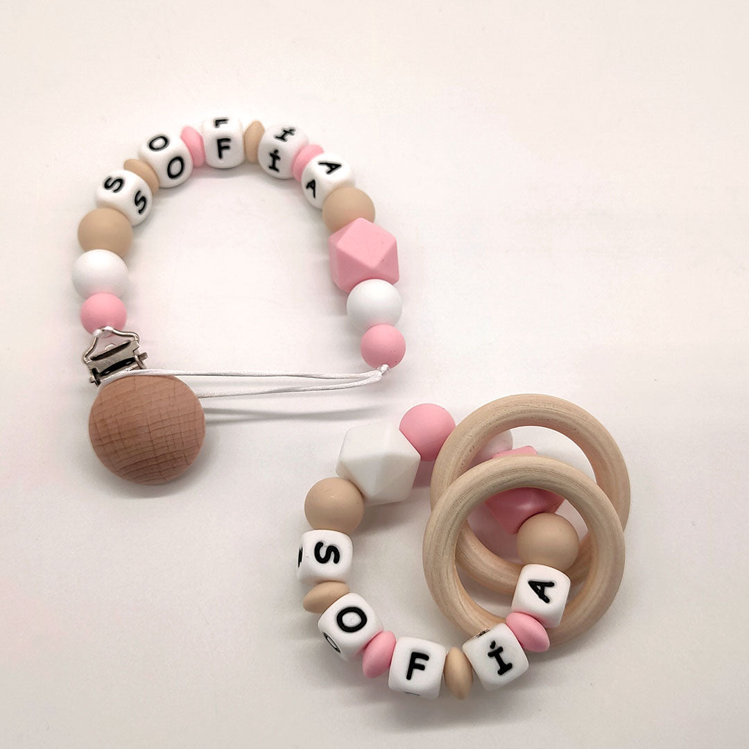 - Según la normativa Europea de Seguridad DIN EN12586:2007, los chupeteros no pueden sobrepasan los 22 cm de longitud (sin contar el clip), por lo que dependiendo del número de letras a colocar, ajustaremos el diseño con más o menos elementos, siempre respetando en la medida de lo posible el modelo escogido.