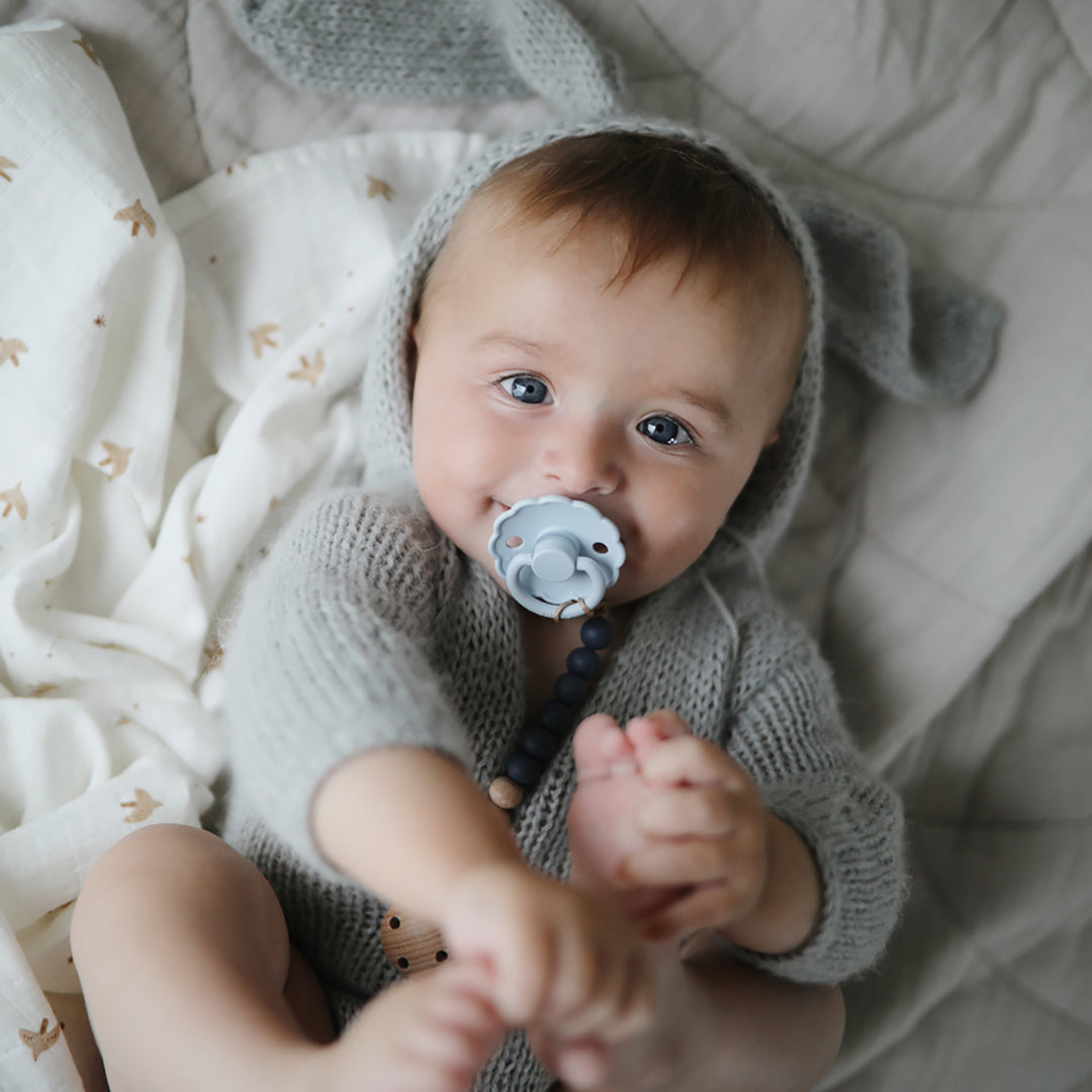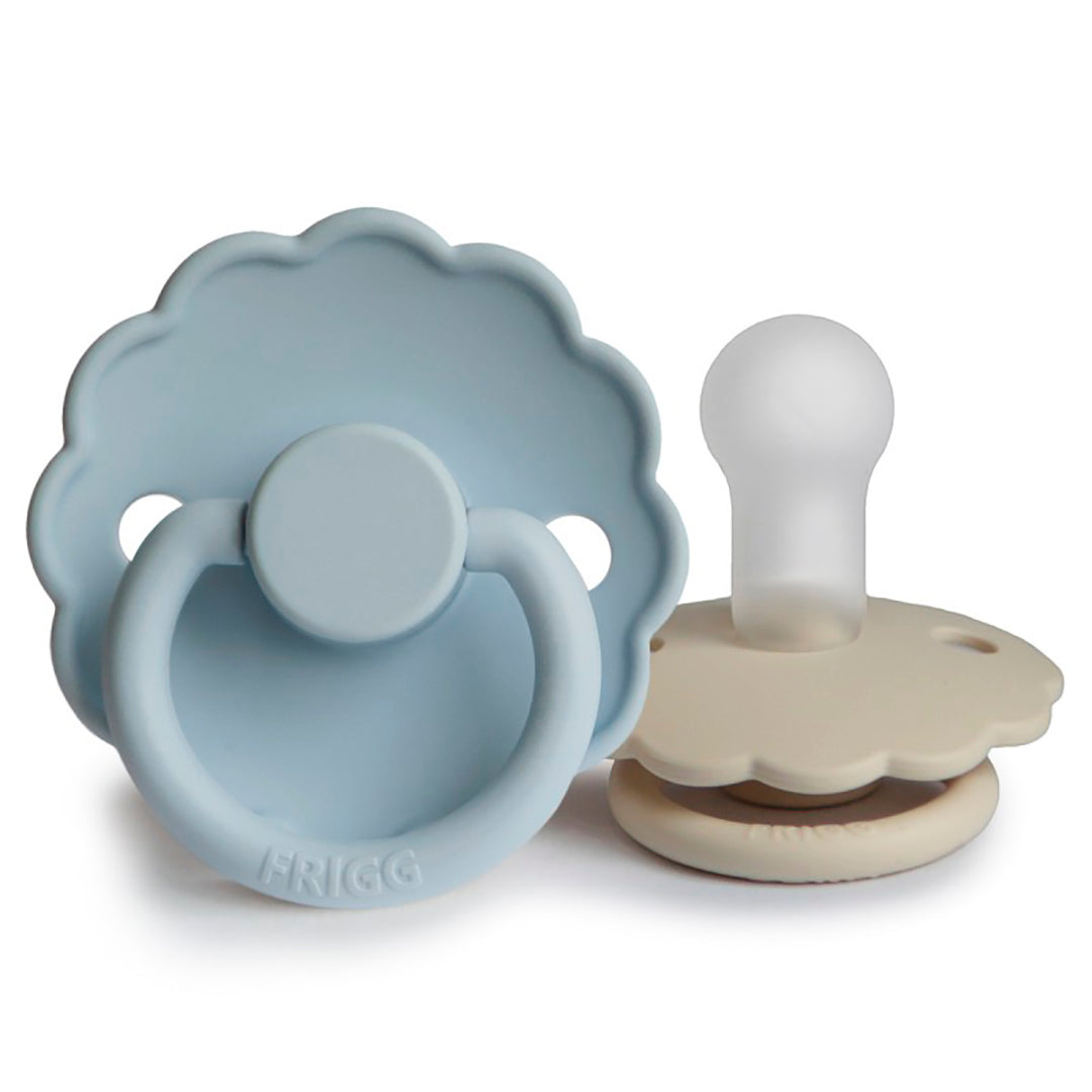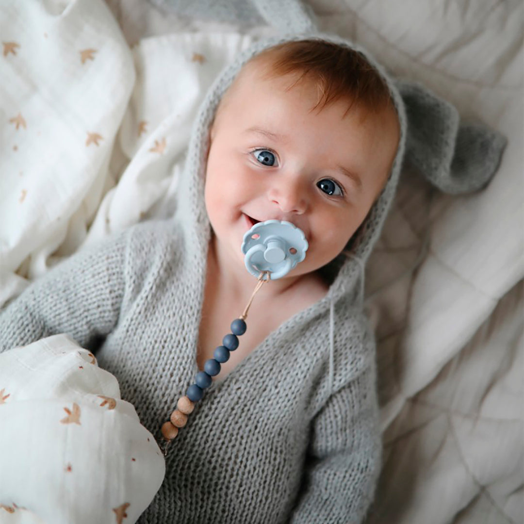 El chupete FRIGG Daisy con bordes adornados que imitan pétalos de flores son la esencia del diseño elegante. Los detalles floridos y modernos llaman la atención de todas las madres preocupadas por el estilo.