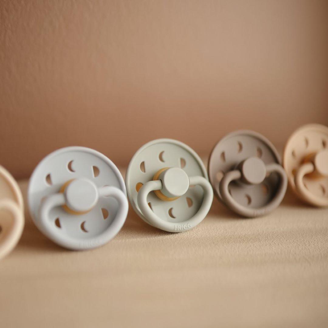 FRIGG Moon Phase es un chupete inspirado en la Luna en movimiento. Las fases lunares cambiantes se reflejan en la estructura del chupete y funcionan como orificios de ventilación para ventilar la piel sensible del bebé. La inspiración Moon Phase continúa en el mango, con forma de media luna.