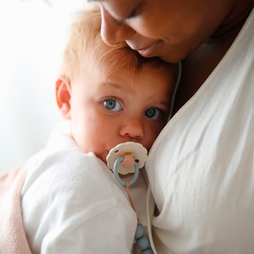 El chupete FRIGG Daisy con bordes adornados que imitan pétalos de flores son la esencia del diseño elegante. Los detalles floridos y modernos llaman la atención de todas las madres preocupadas por el estilo.