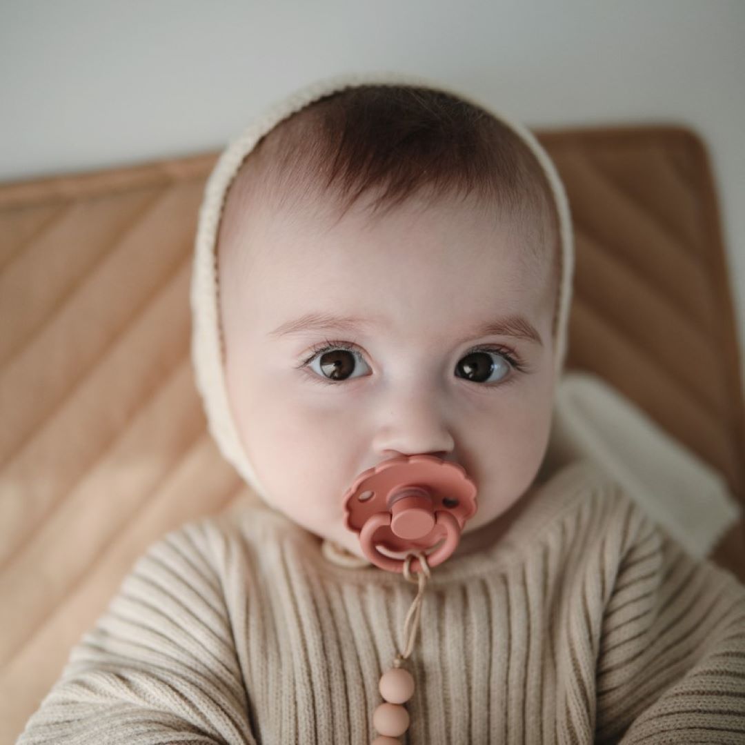 El chupete FRIGG Daisy con bordes adornados que imitan pétalos de flores son la esencia del diseño elegante. Los detalles floridos y modernos llaman la atención de todas las madres preocupadas por el estilo.