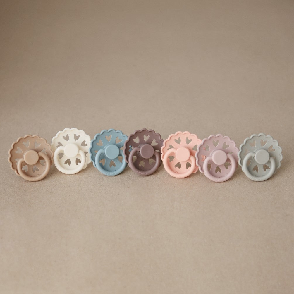 FRIGG Fairytale es un chupete inspirado en la obra del autor danés H. C. Andersen. Es conocido por sus fantásticos cuentos de hadas, pero su mente creativa no solo se mostró a través de sus palabras; también se mostró a través de sus mágicos recortes de papel. FRIGG Fairytale con bordes festoneados y corazones que rodean el escudo imitan un recorte de papel específico de H. C. Andersen. Los 8 corazoncitos sustentan la universalidad de su obra creativa, y simbolizan el amor, el lenguaje universal del mundo. Esta es la inspiración que se encuentra dentro de los chupetes FRIGG Fairytale: son accesibles para todos porque el amor es un lenguaje, todos pueden hablar y entender. Cada color de chupete FRIGG Fairytale lleva el nombre de sus conocidos cuentos de hadas, que dan a los chupetes un toque de imaginación. Color FRIGG - Clumsy Hans (gris sauce)