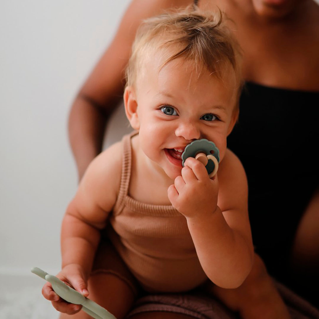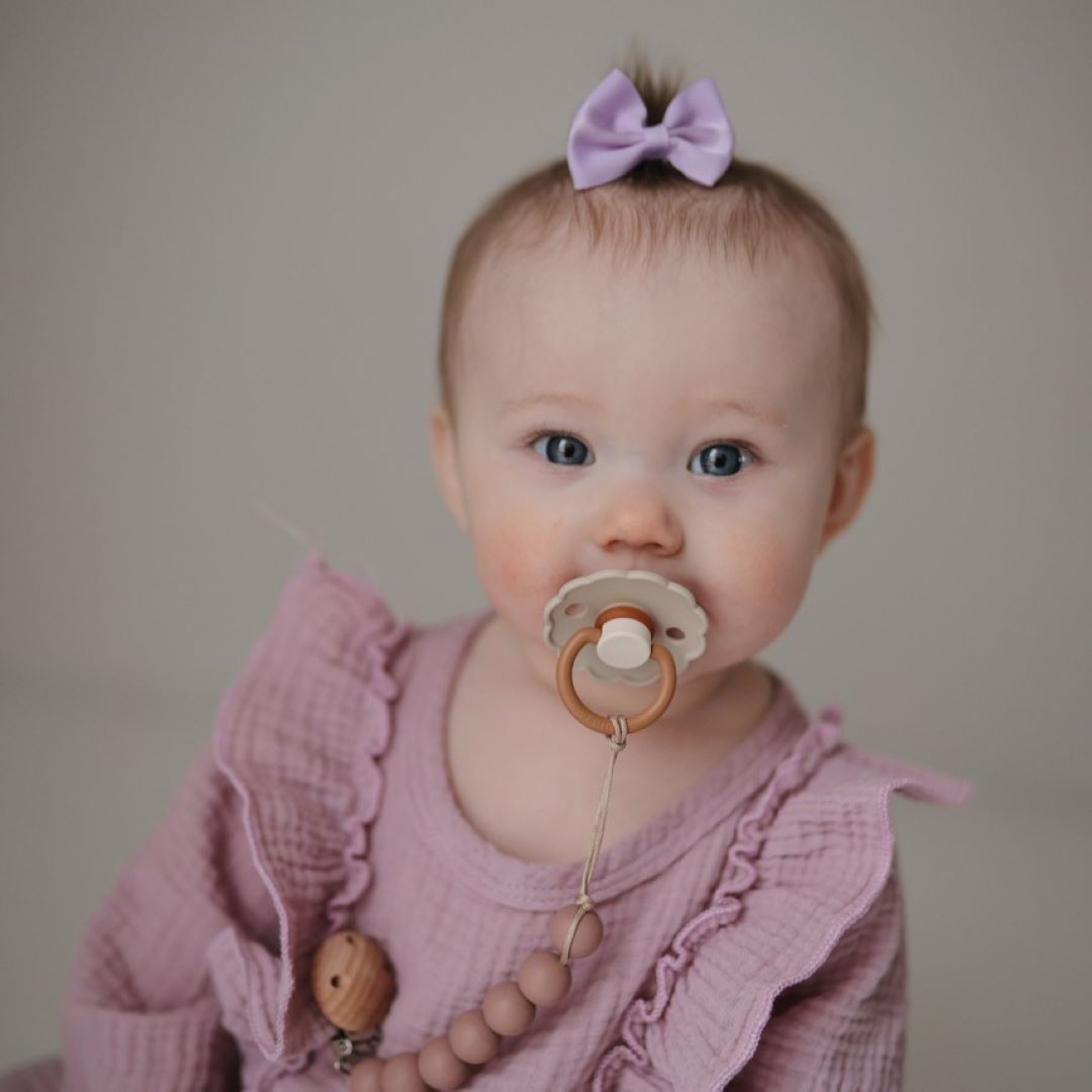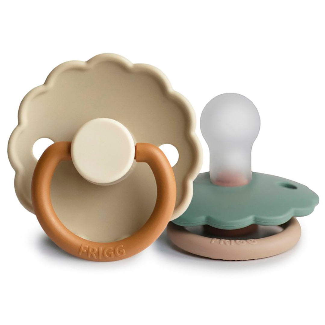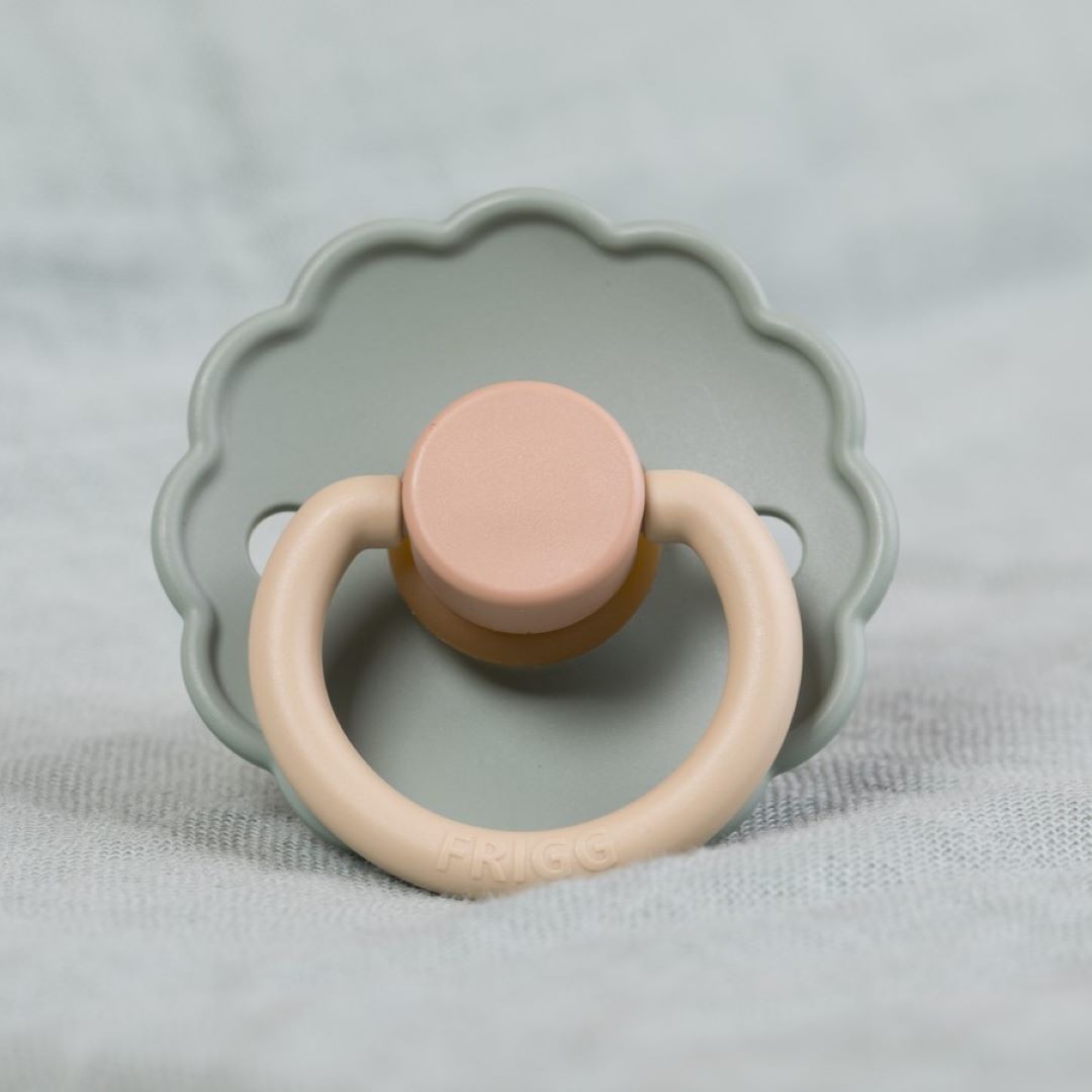 El chupete FRIGG Daisy con bordes adornados que imitan pétalos de flores son la esencia del diseño elegante. Los detalles floridos y modernos llaman la atención de todas las madres preocupadas por el estilo.