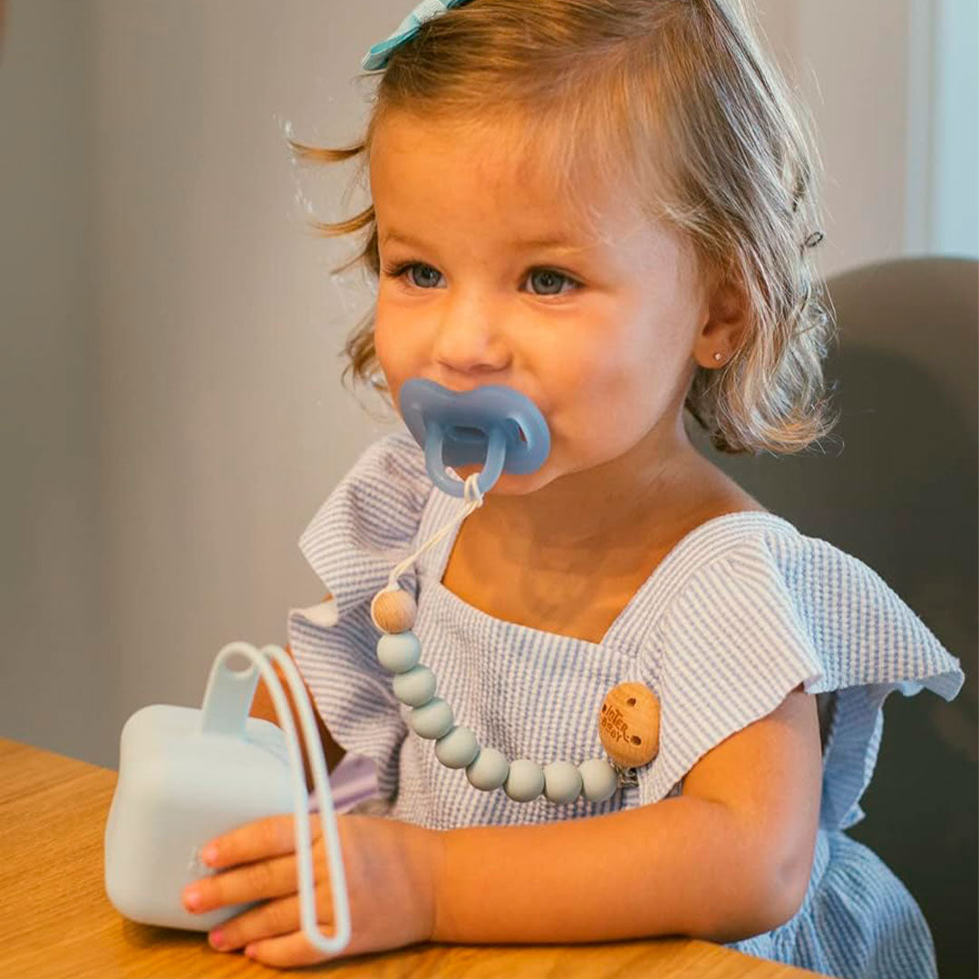Práctico y funcional portachupetes de silicona diseñados para llevar colgado en el carrito y en la silla de paseo, tenerlo siempre a mano. Está fabricado 100% en silicona, puedes lavarlo en el lavavajillas y no desarrolla bacterias.